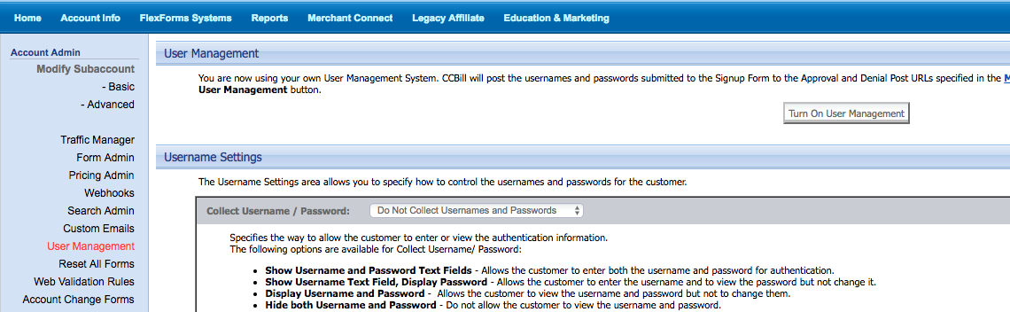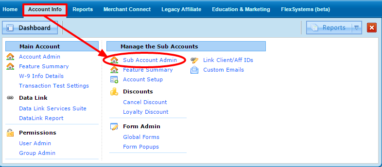 - On the Account Info megamenu, click Sub Account Admin, then User Management.