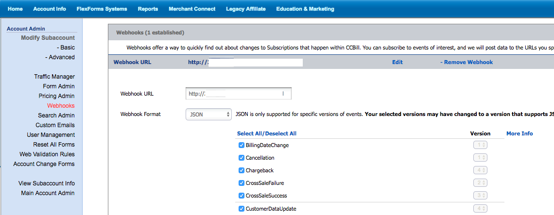 Webhook URL text box with the URL https://yourwebsite.com/webhook/ccbill