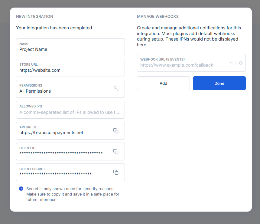 - Get API keys on API & Webhooks section