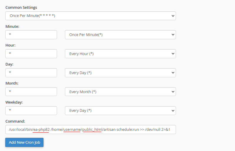 /usr/local/bin/ea-php82 /home/username/public_html/artisan schedule:run >> /dev/null 2>&1