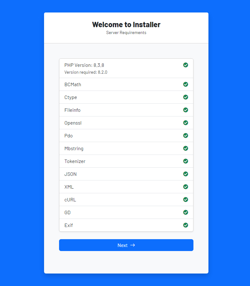 https://yousite.com/install - This screen will appear, all the boxes must be green to proceed with the installation.