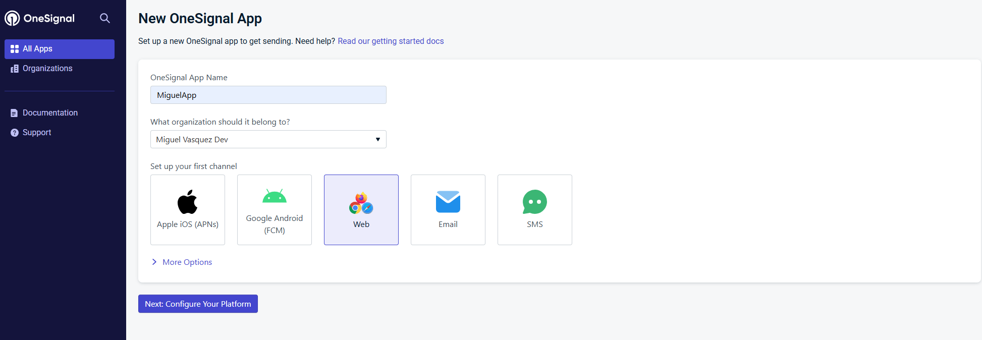 - Step 2: Add OneSignal App Name, select What organization should it belong to? and select Set up your first channel: Web