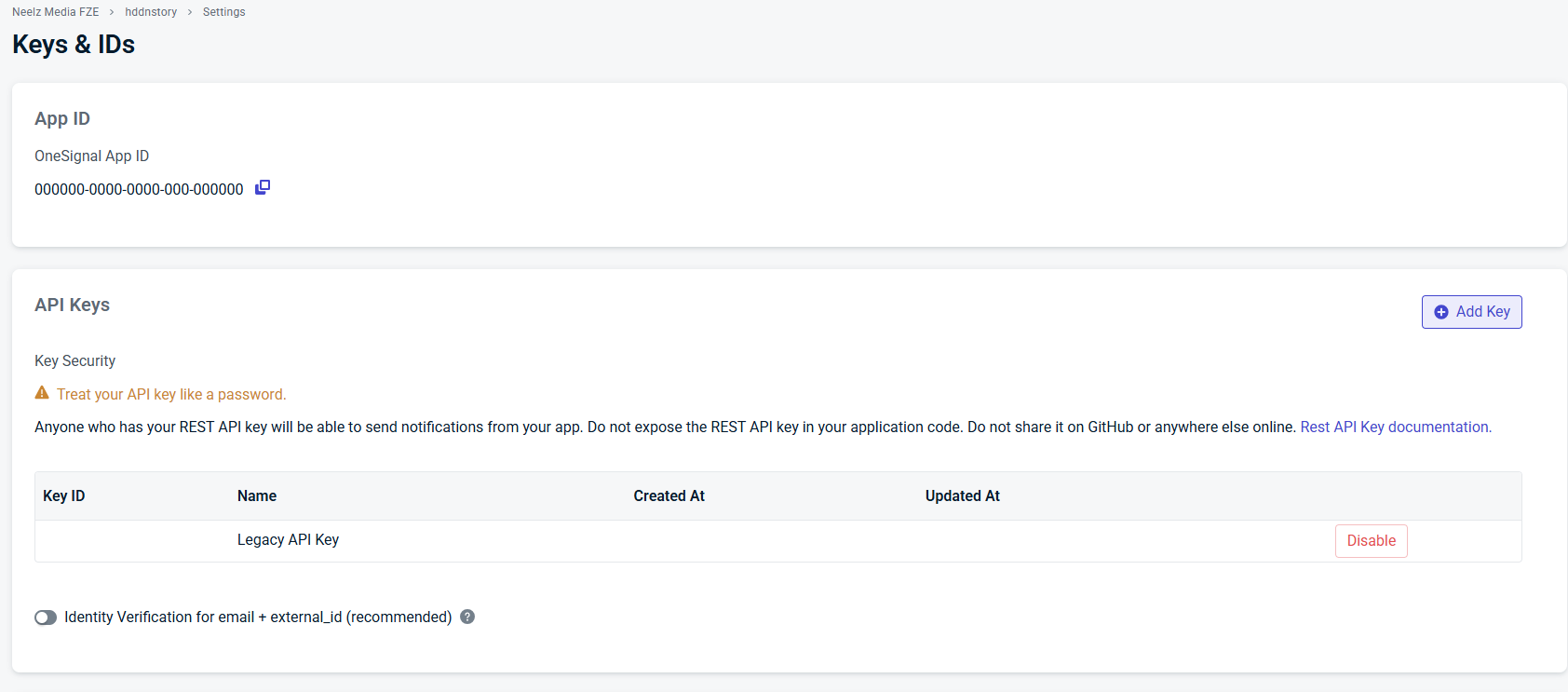 - Step 3: Copy OneSignal App ID And click Add Key to create OneSignal Rest API Key